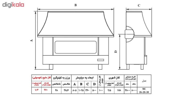 خاری نیک کالا مدل شومینه نفیس NICALA-MC30 در مدل شومینه نفیس بخاری حداکثر قدرت حرارتی 8100 کیلو کالری بر ساعت و حداقل قدرت حرارتی 3800 کیلو کالری بر ساعت می باشد. بخاری شومینه نفیس 30000 نیک کالا قابل استفاده با گاز شهری فشار گاز 178 میلی متر ستون آب بوده و گاز شهری قطر اوریفیس 6/2 میلی متر است. این مدل بخاری نیک کالا دودکش دار می باشد که قطر دودکش آن به 100 میلی متر می رسد.وزن خالص این بخاری 6/36 کیلو گرم و وزن نا خالص 44 کیلو گرم می باشد. گاز مایع فشار گاز 270 میلی متر و گاز مایع قطر اوریفیس 2/1 میلی متر است. رده انرژی در این مدل بخاری گازی E می باشد، و میزان مصرف گاز بهینه ای وجود دارد. کیفیت بخاری های گازی نیک کالا امروزه فقط به ظاهر آراسته و طراحی صنعتی آن نیست . در این بخاری ها با ارتقاء بازدهی حرارتی حدود 20 درصد مصرف گاز کاهش یافته و با صرفه جویی مبلغی را که برای خرید بخاری پرداخت شده است از طریق صرفه جویی به شما باز می گردد . طراحی بخاری زیبا بوده و استاندارد ملی ایران ، استاندارد CE و TSE کیفیت محصول را تایید کرده اند .بخاری گاز سوز نیک کالا NICALA مدل شومینه MC30 محصولی با کیفیت و در عین حال شیک نیک کالا می باشد که محیط خانه و محل کار شما را در فصول سرد سال، گرم خواهد کرد. باید به این نکته توجه کرد که حداقل فاصله بخاری از دیوار 30 سانتی متر و از مواد قابل اشتعال 150 سانتی متر باشد. در ضمن این بخاری مجهز به سیستم ایمنی ODS جهت کنترل میزان اکسیژن محیط بوده و با کاهش یافتن از یک میزان معین و ایجاد خطر دستگاه را خاموش می کند.